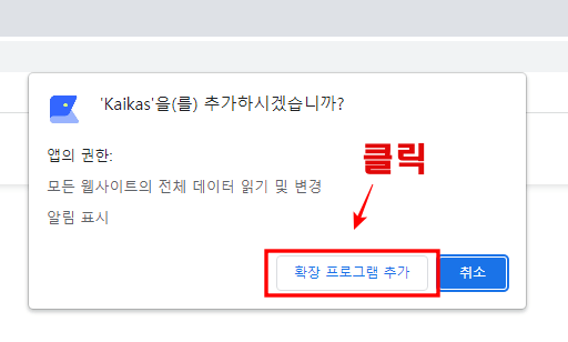 다음과 같이 크롬에 ‘kaikas’를 추가해 주시면 됩니다. ‘확장 프로그램 추가’를 클릭해 주세요. 그럼 크롬에 설치가 완료되게 됩니다.